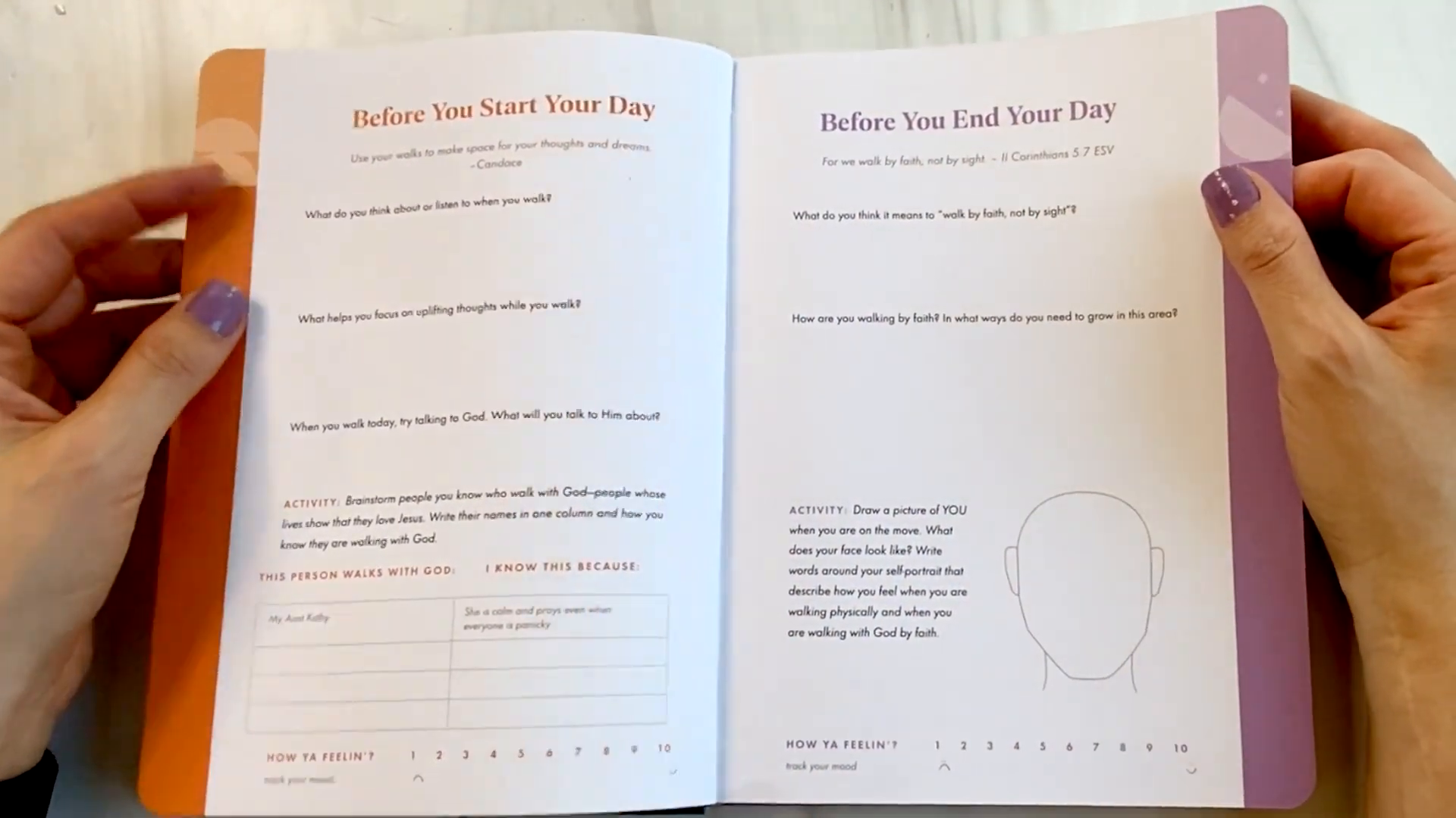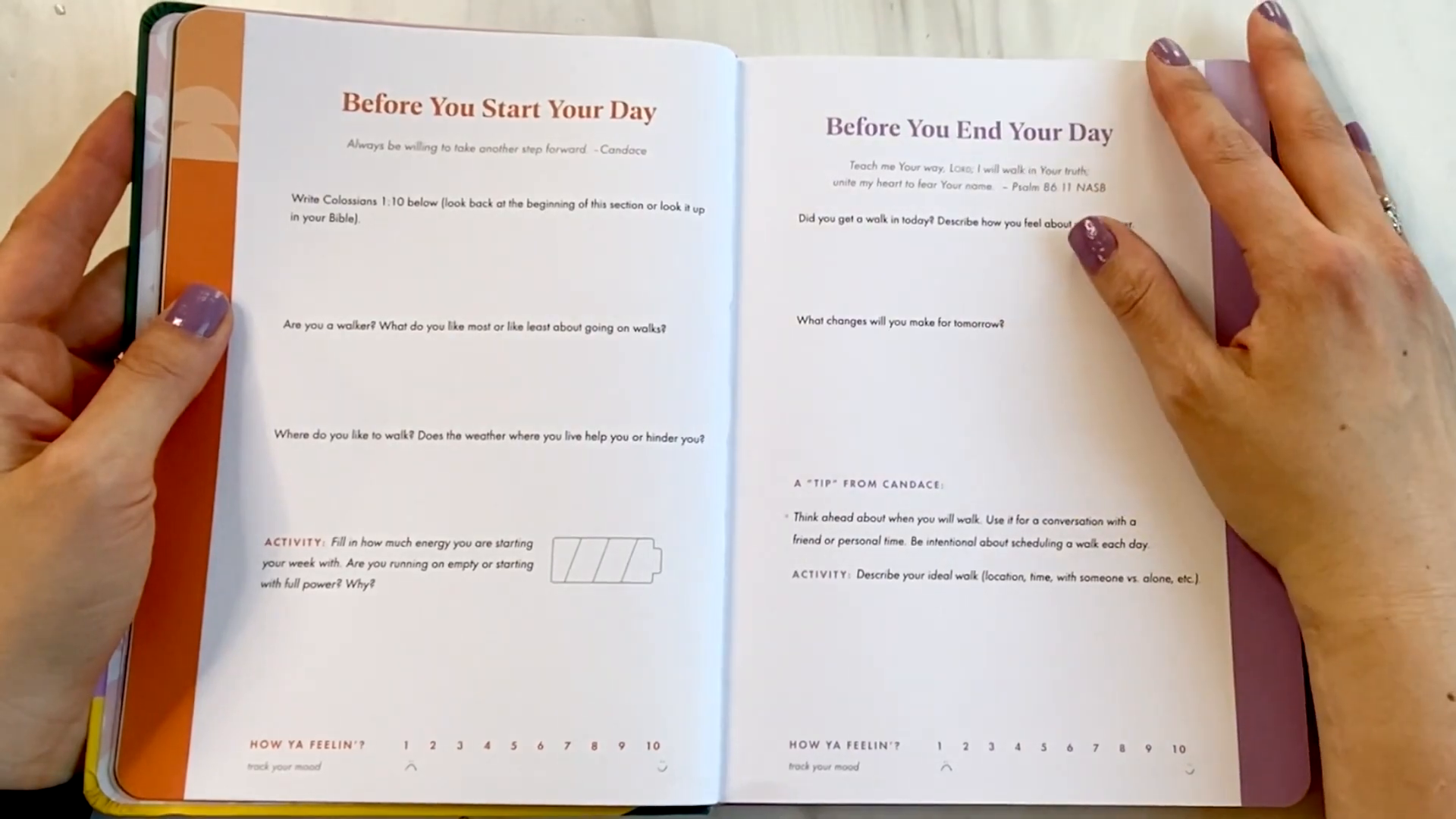 The journal includes daily prompts that encourage users to engage in self-reflection. For instance, users are asked to rate their energy levels on a scale of one to ten, track their walks, and reflect on their prayers. This interactive approach makes the journaling experience more dynamic and engaging.