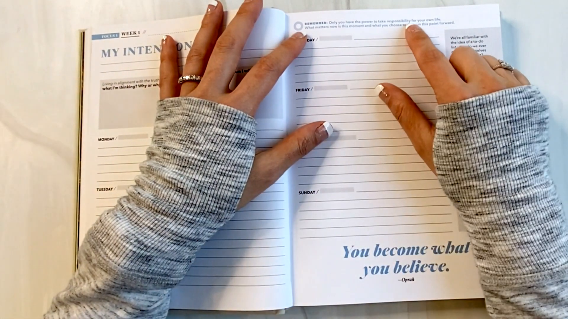 The cover features a ribbon that adds an elegant touch. Inside, you find motivational quotes and affirmations, including Oprah’s principle that "thought by thought, choice by choice, we are co-creating our lives based on the energy of our intention." This sets a positive tone for the planner, encouraging users to focus on their intentions and goals.
